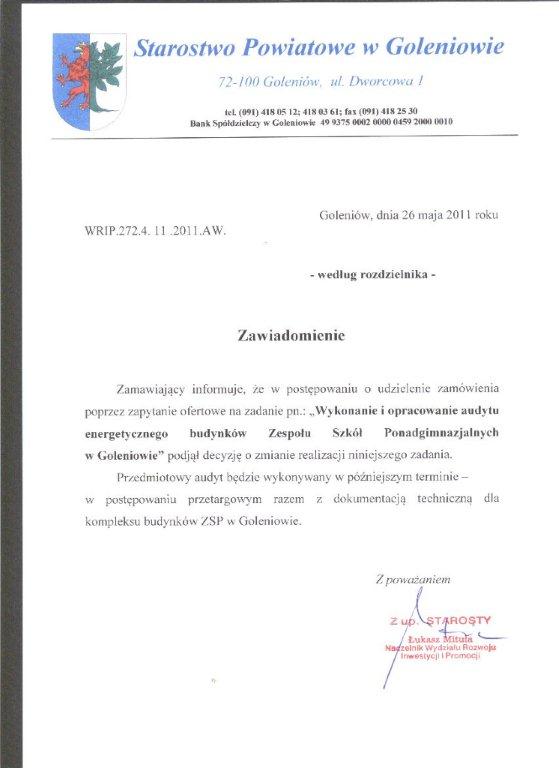 Zawiadomienie o zmianie realizacji zadania pn: "Wykonanie i opracowanie audytu energetycznego budynków Zespołu Szkół Ponadgimnazjalnych w Goleniowie"