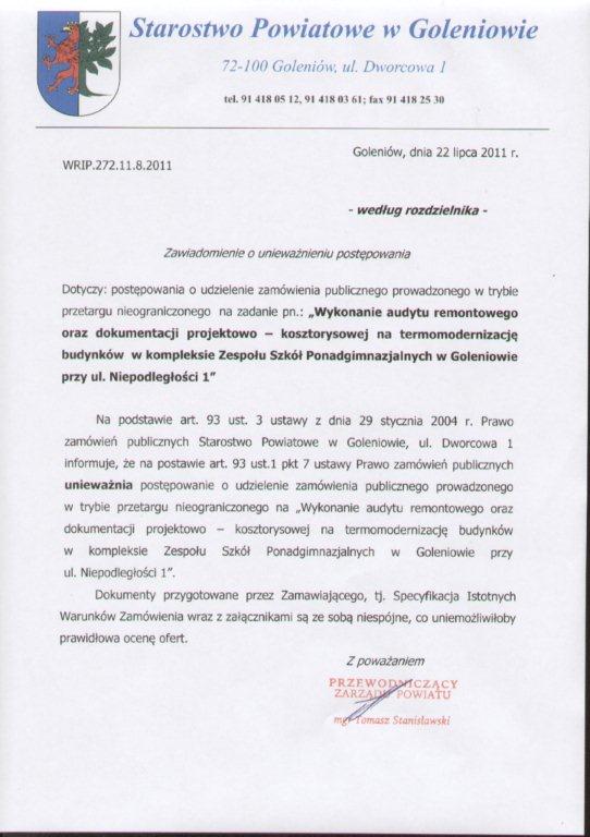 Zawiadomienie o unieważnieniu postępowania na zadanie pn.: "Wykonanie audytu remontowego oraz dokumentacji projektowo - kosztorysowej na termomodernizację budynków w kompleksie Zespołu Szkół Ponadgimnazjalnych w Goleniowie przy ul. Niepodległości 1"