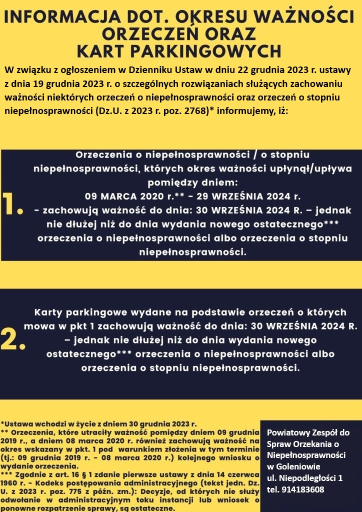 Informacja dotycząca okresu ważności orzeczeń i kart parkingowych-obowiazuje od 30 grudnia 2023 r.